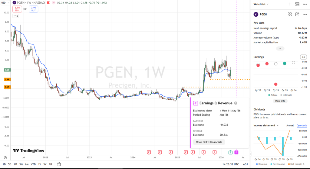 - Financial Instability: Despite rising revenue, PGEN reported a staggering $429.6 million net loss for 2025. Management attributes this to one-time $318.5 million in non-cash charges related to preferred stock warrants that will not recur. Still, there is fear of potential share dilution if cash-flow targets are missed.